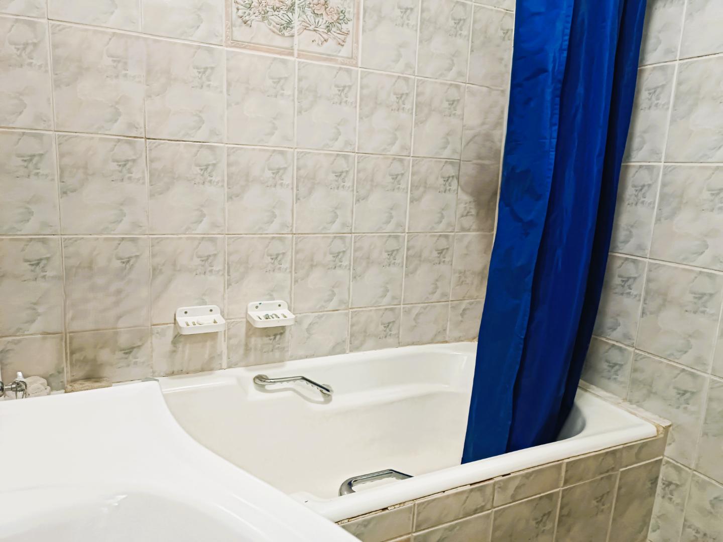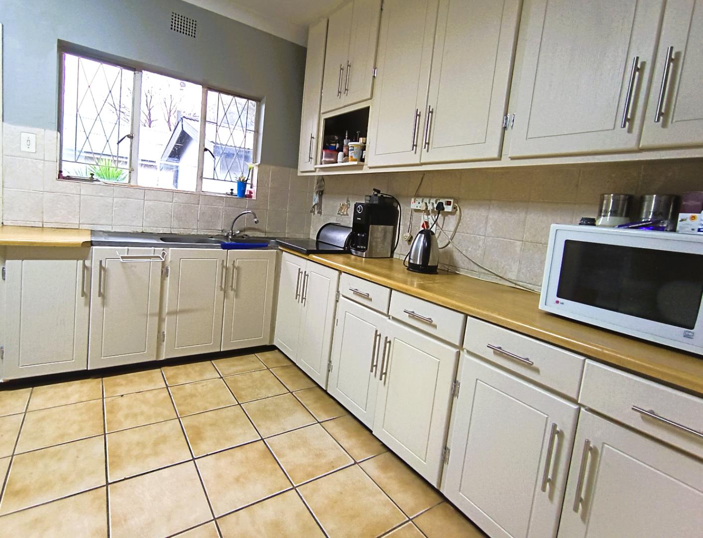 The kitchen is practical and well laid out, offering a double sink, ample cupboard space, and room for a double-door fridge. A dining room just off the kitchen opens onto the garden through a sliding door, making it easy to enjoy indoor-outdoor living.
